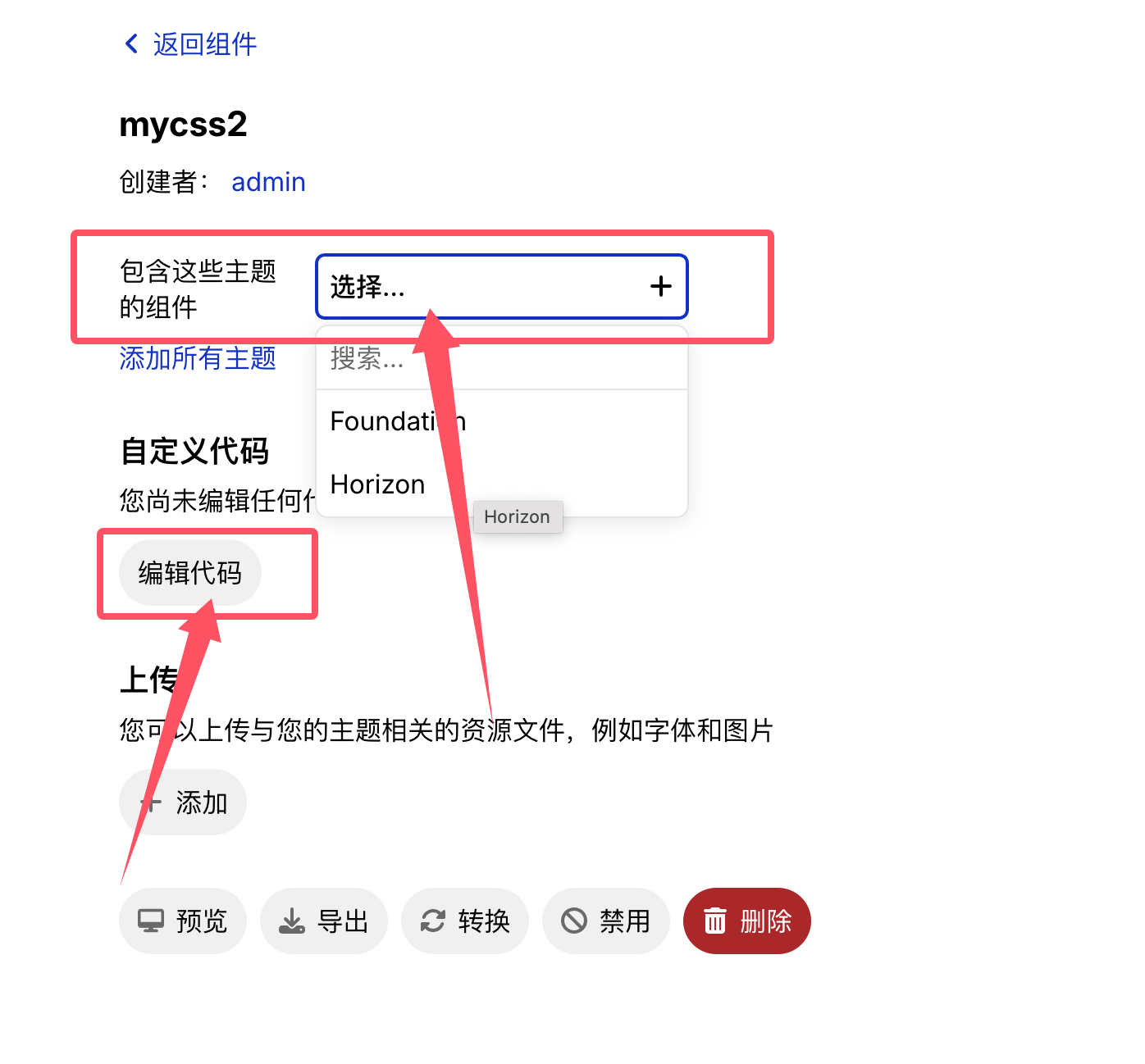 创建后,就来到组件编辑页面。选择你使用的主题。然后点击编辑代码