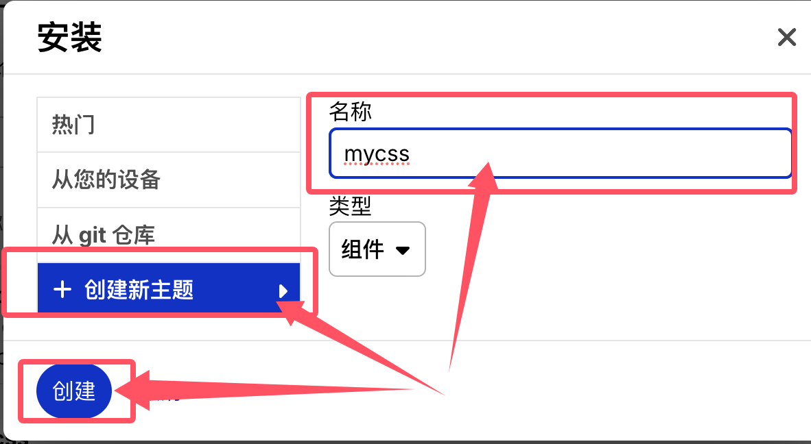 选择创建组件,自己写一个名称。类型,默认为组件。点击创建。