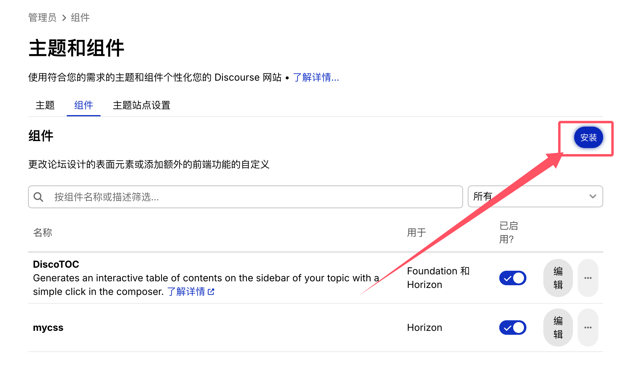 第一步,来到组件管理:/admin/config/customize/components 点击安装按钮