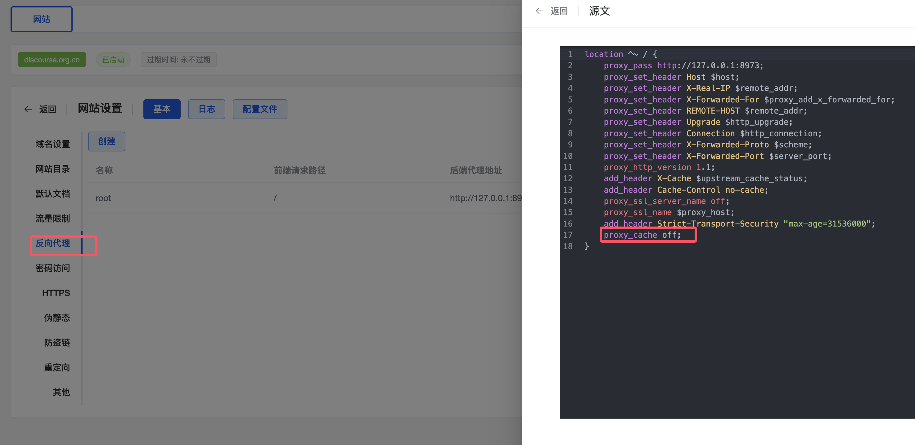 另外宝塔面板安装的Discourse也有这个问题。如果你是按本站教程安装的,按下图的位置添加proxy_cache off;即可。