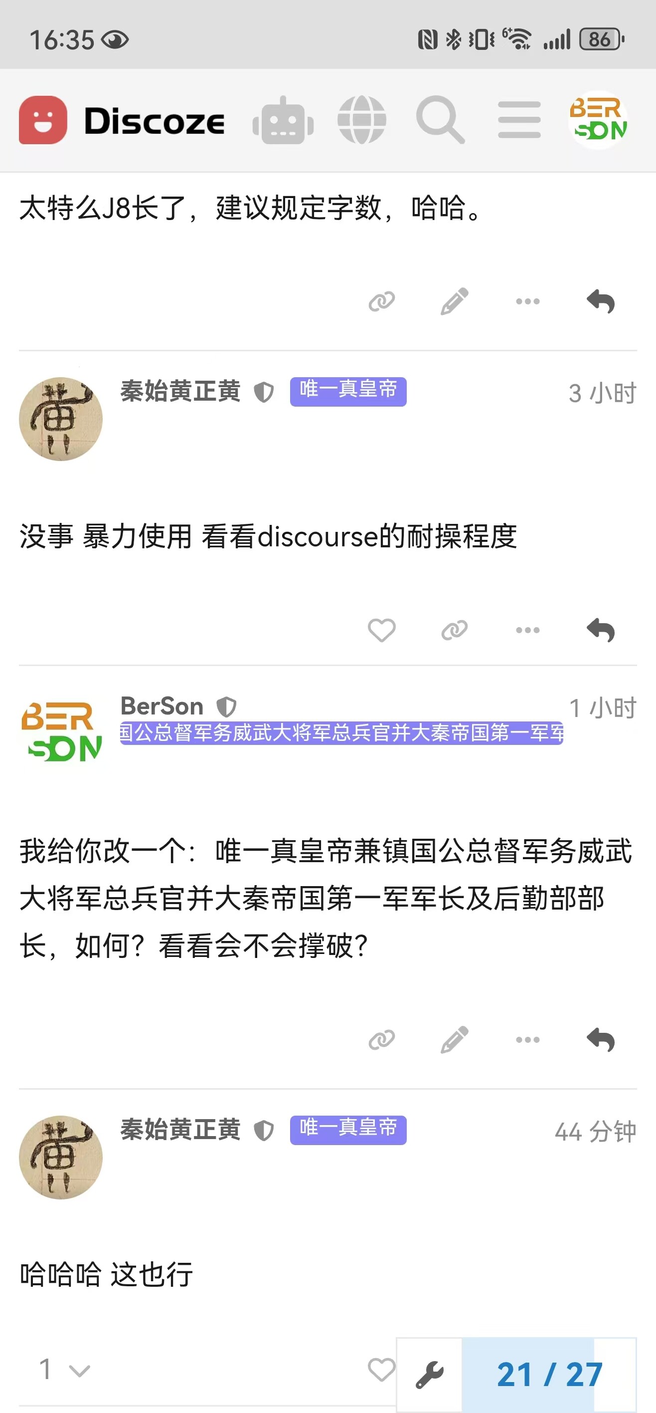 我给你改一个:唯一真皇帝兼镇国公总督军务威武大将军总兵官并大秦帝国第一军军长及后勤部部长,如何?看看会不会撑破?
