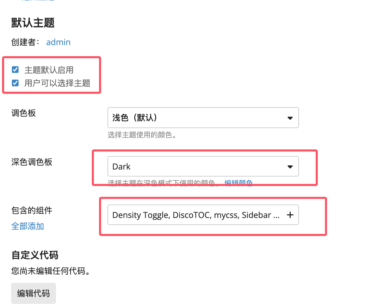 再新建一个主题,比如“默认-宽屏”,默认不启用,用户可选择,深色调色板选Dark,包括组件,刚装的这几个,在加上Full width。