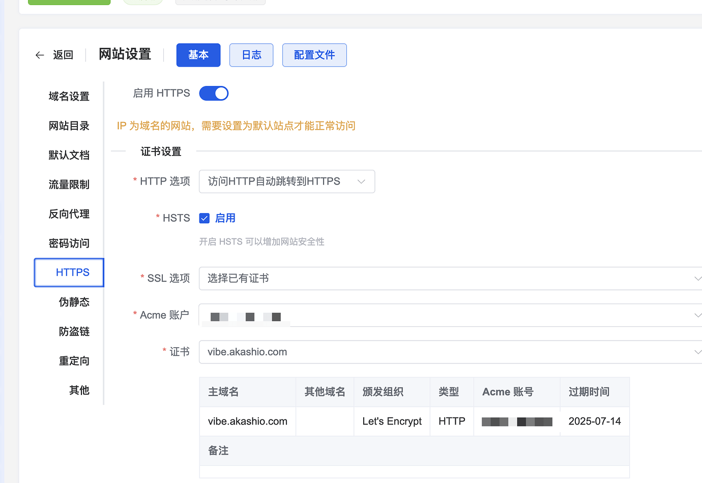 在 1Panel 里,点刚才创建的网站,点配置,选择 HTTPS,打开自动跳转,根据提示跳转到证书页面创建证书。然后回到这里配置好证书,你的安装就结束了。