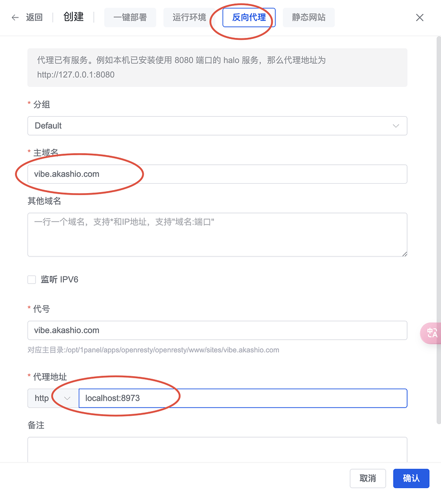 如图,进入 1Panel 的网站里,创建一个新的网站,类型选择反向代理,域名写上你刚才在配置里填的域名,反向代理的地址填上 localhost:8973。如果你刚才改了端口,这里就也要改一下端口。