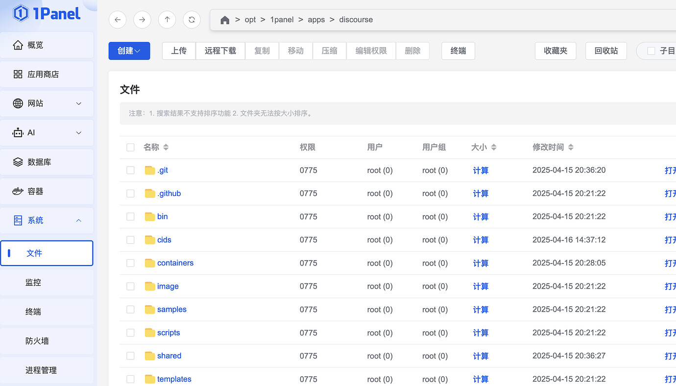 进入 1Panel > 系统 > 文件,创建一下这个目录:/opt/1panel/apps/discourse/